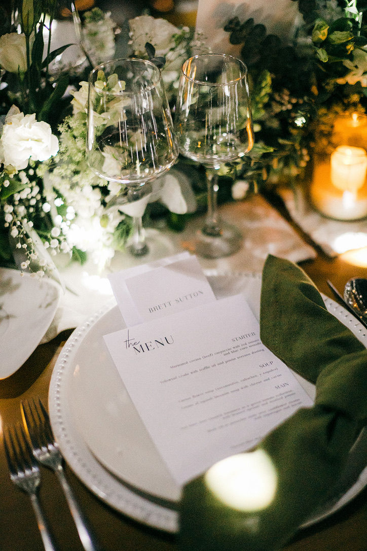 Ana quería mucha luz en la recepción de su boda, y justo eso fue lo que creamos para ella. Flores blancas y follajes adornaron cada mesa, y los nombres de las mesas eran un guiño especial para cada uno de los asistentes. Los detalles no pararon: las notas de agradecimiento personalizadas esperaban a cada invitado en su lugar. Nos encantó hacer esta boda para ellos.
